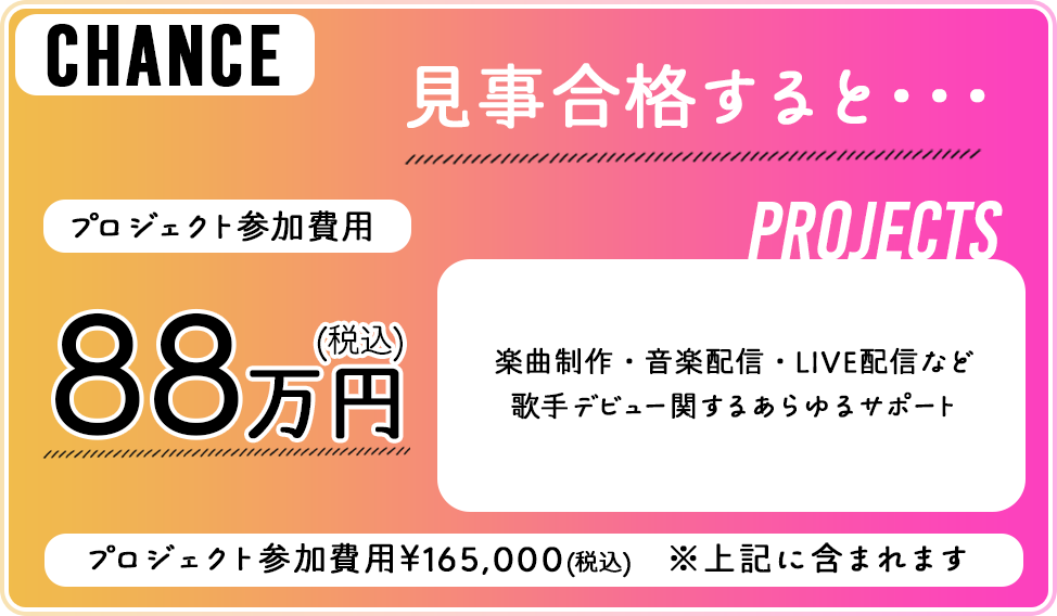 🅰. オーディション参加において費用発生しませんので、お気軽にご応募ください。※選考後、プロジェクトへの参加が決定した場合は費用をご負担いただきます。